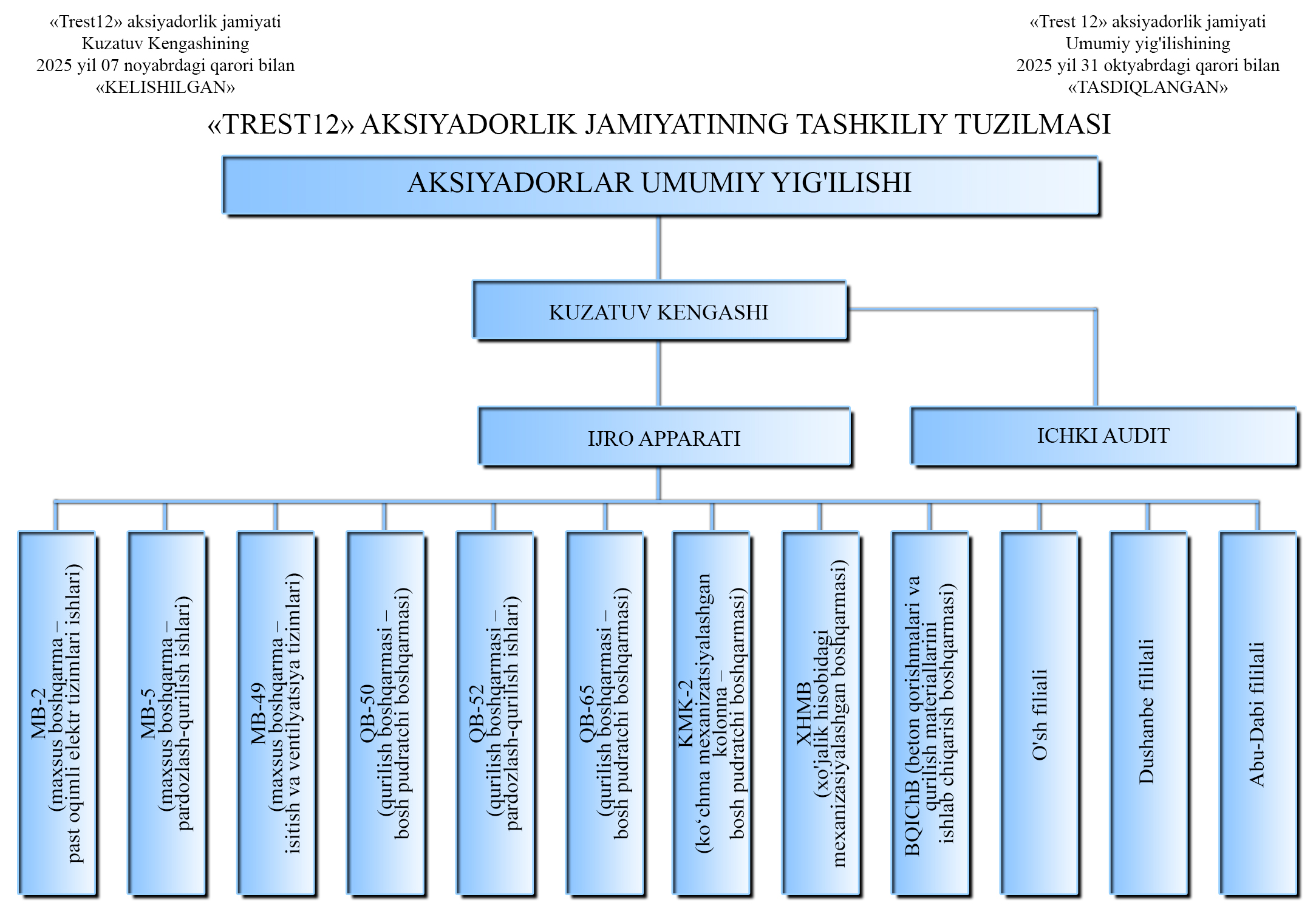 "TREST 12" AJning tashkiliy tuzilmasi amalda o'z davomiyligini isbotladi, ishlar kompleksini amalga oshirilishini ta'minlaydi, qisqa vaqt ichida pudrat shartnomasi asosida muhim hajmdagi ishlarni bajarish uchun zarur moddiy, kadrlar va texnik resurslarni safarbar qilishga imkon beradi.